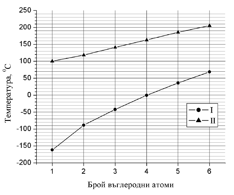 А) Посочете номера на кривата (I или II), която се отнася за хомоложния ред на алканите.