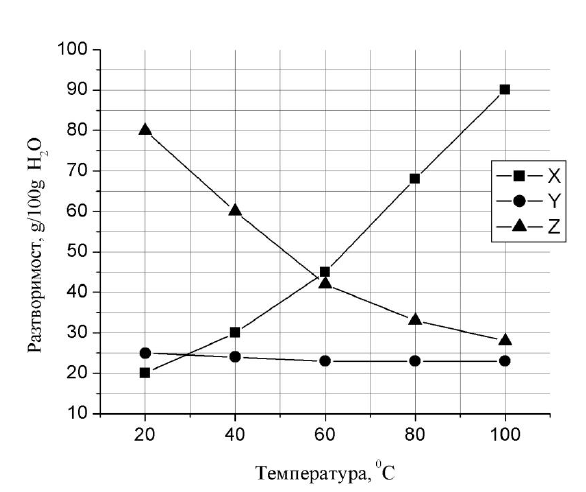 А) Кое вещество – X, Y или Z има най-голяма разтворимост при 40 0С?